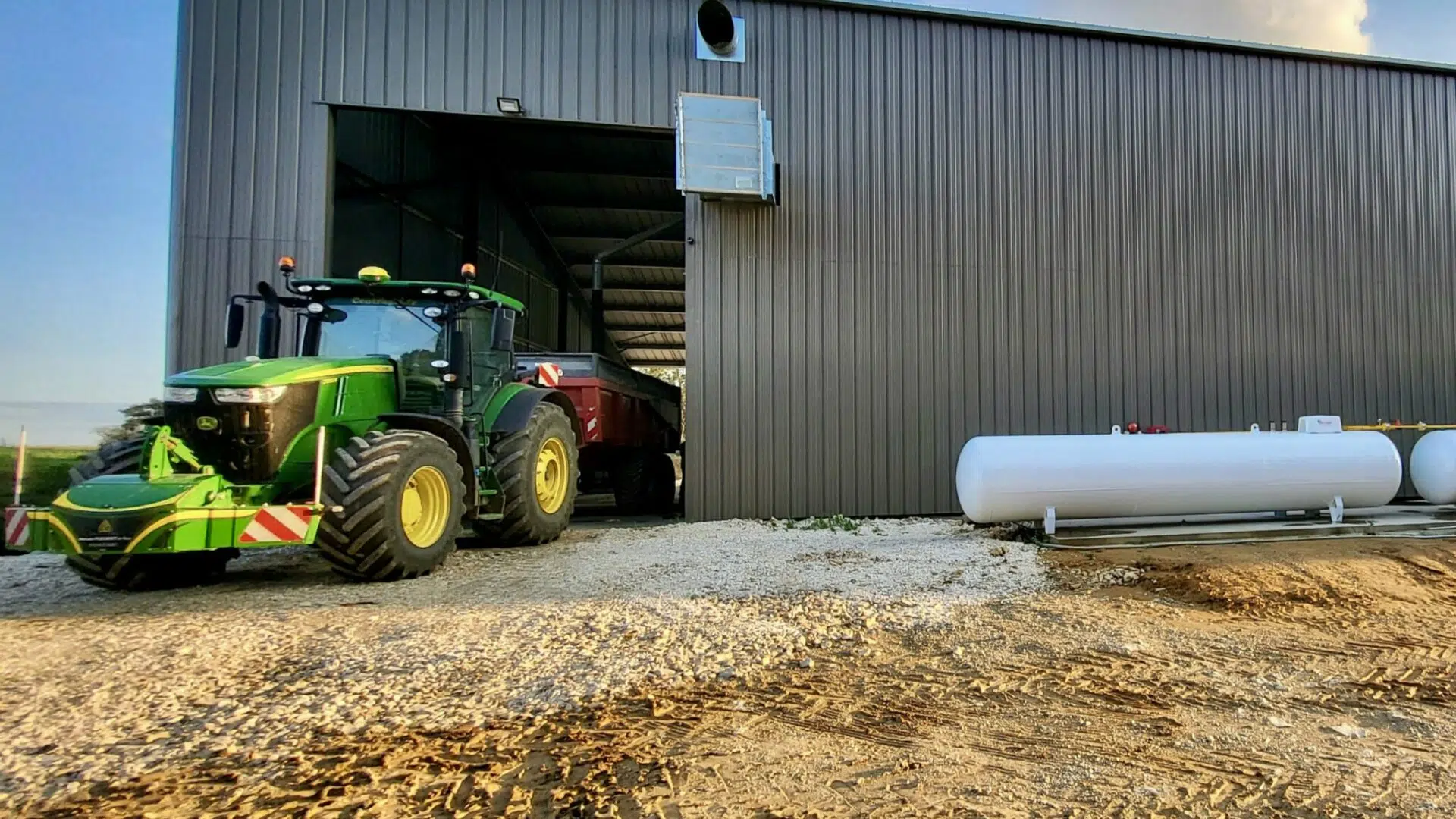 installation clé en main Agriconsult ciel bleu extérieur bâtiment photovoltaïque tracteur John Deere déchargement benne boisseau céréales grains silos cellules fond conique